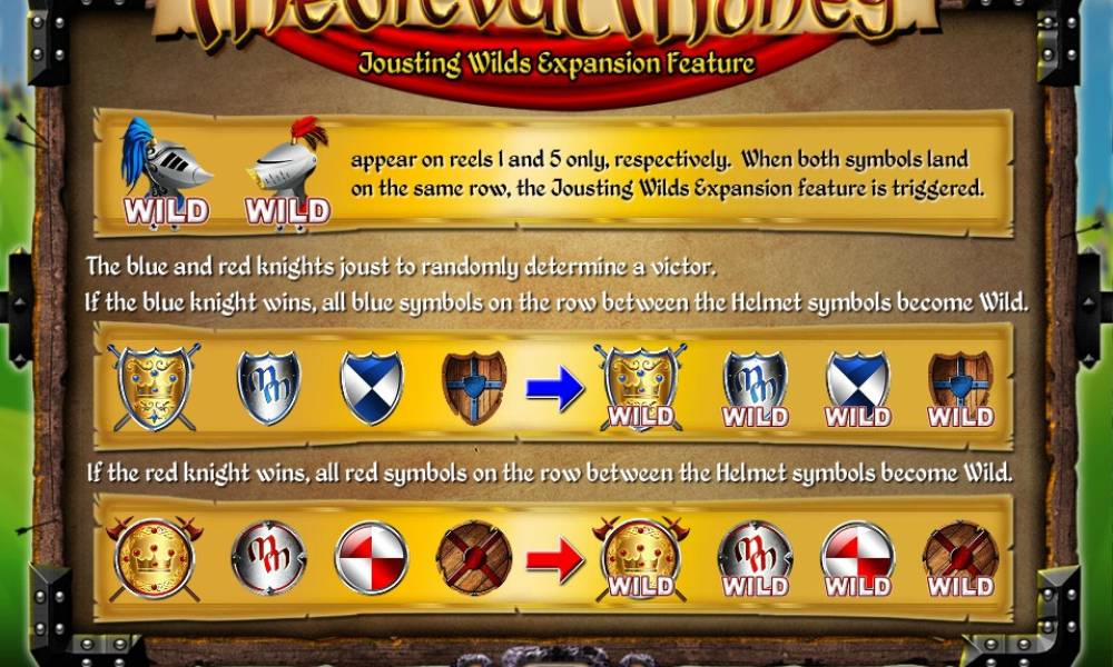 Medieval Money – видео-слот с пятью барабанами, двадцатью постоянно задействованными линиями и пятнадцатью символами на главном экране (5х3). Ставки по активным полосам всегда равны. Вы сможете поставить на каждую от одного до ста кредитов (на примере Mr.Green casino). На раунд принимается не менее двадцати единиц и не более двух тысяч (уточняйте диапазон в выбранном вами заведении). Аппарат имеет разные виды картинок, включая несколько особых символов, фри-спины, уникальные бонусы и другие призовые функции, обсуждаемые в соответствующем разделе статьи. Чтобы получить выплату по обычным изображениям, необходима цепочка из нескольких одинаковых элементов, начинающаяся на активной полосе с первого барабана слева. Учитывается лишь наиболее длинная последовательность на линии. Размер выигрыша определяется перемножением ставки на полосу и коэффициента образовавшейся комбинации (от х5 до х1000). Они перечислены в специальной таблице Нередко бывает сразу несколько последовательностей в одном спине, но они должны получиться на разных линиях. Деньги в таких случаях суммируются. Игры на удвоение в Medieval Money нет. Ниже рассматриваются особые символы и бонусы, доступные в слоте.
