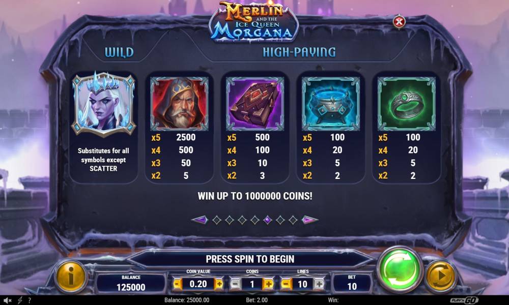 Опробовать игровой автомат Merlin and the Ice Queen Morgana от провайдера Play'n Go без риска вы можете на нашем сайте. Для этого запустите демо-режим слота на этой странице.