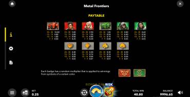 У Metal Frontiers крупное поле размером 5х6. Общее количество знаков — 12, из них 2 специальных. Старшие знаки поделены на 2 группы, по 3 знака в каждой. У одной красный фон, у другой зеленый. Выигрыши формируются без линий и без привязки к барабанам: нужно, чтобы на любой части поля появились 7+ одинаковых символов — их ячейки могут даже не соприкасаться друг с другом. При каждой выплате запускается каскад: символы из выигравшей комбинации удаляются, на их место падают новые. Если после каскада снова удалось выиграть — каскад запускается снова.