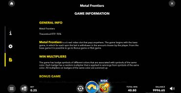 Для знакомства с интерфейсом и правилами можно поиграть в бесплатное демо. Демоверсии Metal Frontiers есть в казино, которые его уже добавили. Обычно они работают без регистрации. Но проще запустить демоигру на этой же странице: мы добавили ее в начало.