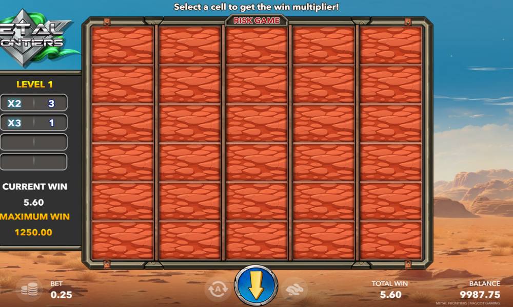 Risk Game. Риск-раунд можно запустить после любого выигрыша. Для этого рядом с кнопкой вращения появляется кнопка Risk. В раунде есть поле 5х6 с закрытыми ячейками. Под каждой скрывается какой-то символ. Есть 4 вида символов: взрывчатка (проигрыш и завершение раунда), множитель (х2 и х3 на старте), улучшение (случайный закрытый множитель увеличивается на +х1) и повтор попытки.