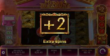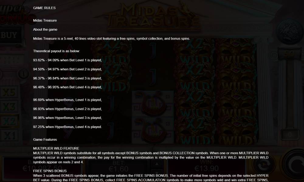 В Midas Treasure есть 3 вида вращений — простые, бесплатные и бонусные. Бесплатные можно выиграть или купить. Бонусные запускаются при накоплении нужного количества символов. Игра ведется на поле 5х4. Выплаты складываются по 40 фиксированным линиям слева направо (в бонус-раунде — не по линиям, а за количество накопленных символов). Гемблер может выбрать ставку в диапазоне от 0.40 до 100 и выиграть не более чем х1000. Максимальную выплату можно поймать только в бонус-раунде.