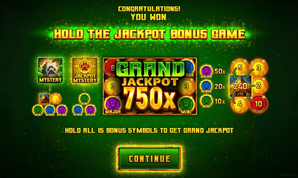 Hold the Jackpot активируется при выпадении 6 или более бонусных символов Hold the Jackpot. Игра разворачивается на сетке из 15 барабанов, и собранные бонусные символы становятся липкими. Каждый новый символ сбрасывает счетчик до 3 респинов. Заполнение всей сетки приносит Grand Jackpot — 750x ставки.
