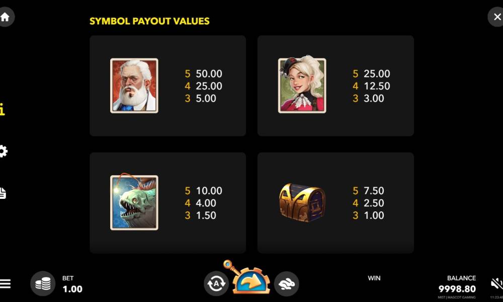 Автоигру можно настроить: выбрать количество вращений (от 10 до бесконечности), задать остановку при выигрыше (любом или на определенную сумму), и задать остановку при увеличении или снижении баланса на 10-100%. Справа отображается баланс, часы и настройки звука. Слева находится кнопка Bet, по которой можно изменить размер ставки, и кнопка меню. В меню есть 3 вкладки: Информация (о символах), Настройки (здесь можно включить звук, запустить автоспин, развернуть на весь экран) и Описание. Чтобы запустить Mist: