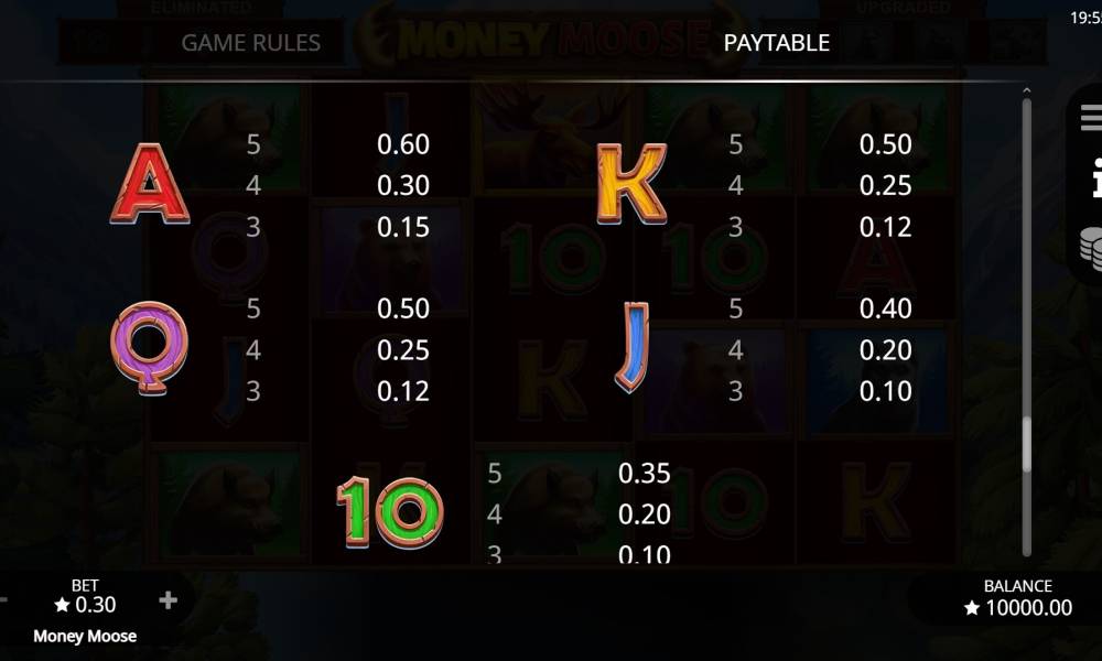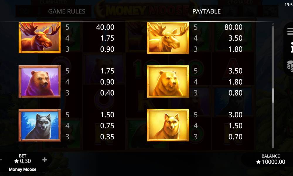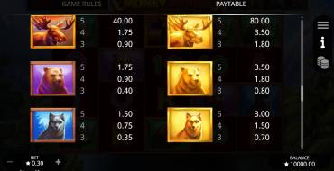 Игровой автомат Money Moose от провайдера Booming Games имеет стандартное игровое поле из 5 барабанов по 4 символа. Выплаты производятся по 30 игровым линиям.