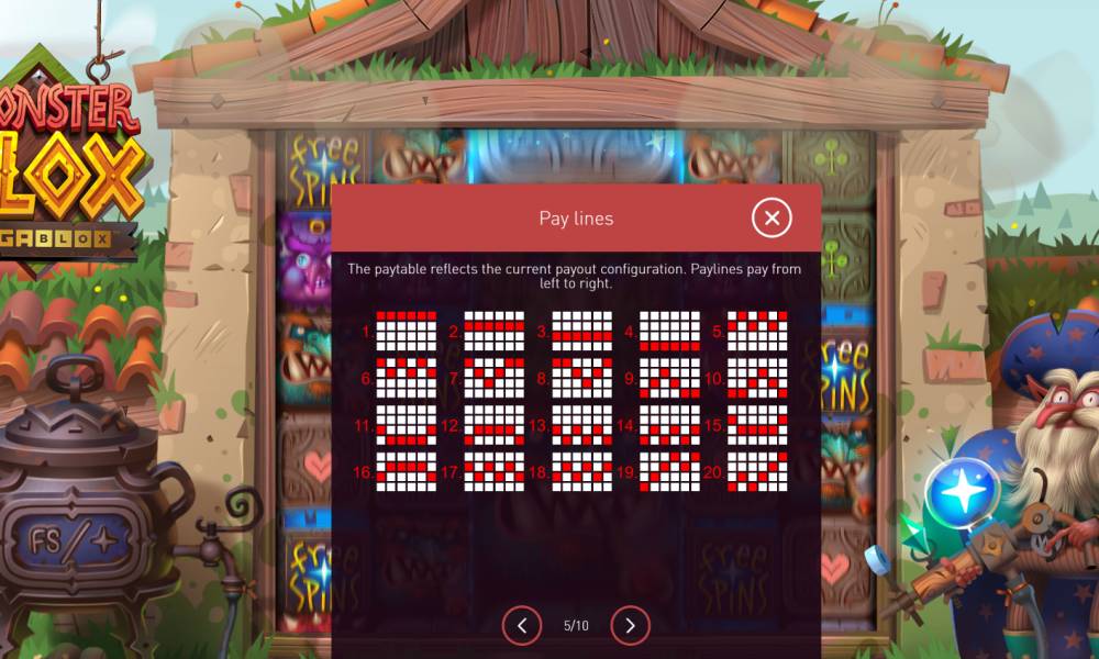 Monster Blox — это слот с 6 барабанами и 4 рядами, которые могут расширяться до 8 рядов. Игровое поле начинается с 40 выигрышных линий, увеличивающихся до 100 линий. Комбинации формируются слева направо, начиная с первого барабана. Размер ставок — от 20 до 10 000 монет за одно вращение. Максимальный выигрыш достигает 7500x от ставки. В игре доступна риск-игра, а также множество бонусов и фриспинов, которые делают процесс еще интереснее.