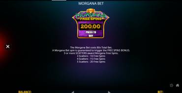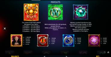В видеослоте Morgana Megaways задействовано 6 барабанов с произвольным количеством рядов (от 2 до 7), ячеек и выигрышных линий, что и составляет главную особенность механики Megaways. Каждое вращение выдает рандомное количество символов. Чтобы комбинация стала выигрышной, необходимо, чтобы одинаковые символы расположились на барабанах подряд начиная с крайнего левого. На поле может одновременно сложиться несколько линий выплат. Общее количество вариантов выигрыша составляет 117 649, для наглядности число возможных путей демонстрируется на счетчике над игровым полем. Общая выплата рассчитывается умножением множителя для каждого символа на число выигрышных способов. Символы могут различаться по высоте, они всегда рассматриваются как отдельные элементы выигрышной линии и оплачиваются в соответствии с таблицей выплат при выпадении на барабанах в количестве 3 и более штук (для символа Фея Моргана – 2 и более штук). Игроки могут поставить от 0.20 до 20 евро.