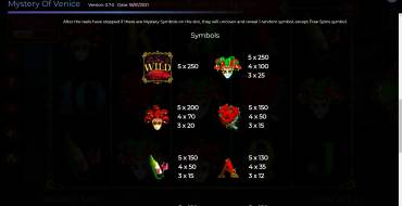 Игровое поле слота Mystery Of Venice от провайдера Spinomenal представлено 5 барабанами по 3 символа в каждом. Все выплаты осуществляются по 20 игровым линиям.