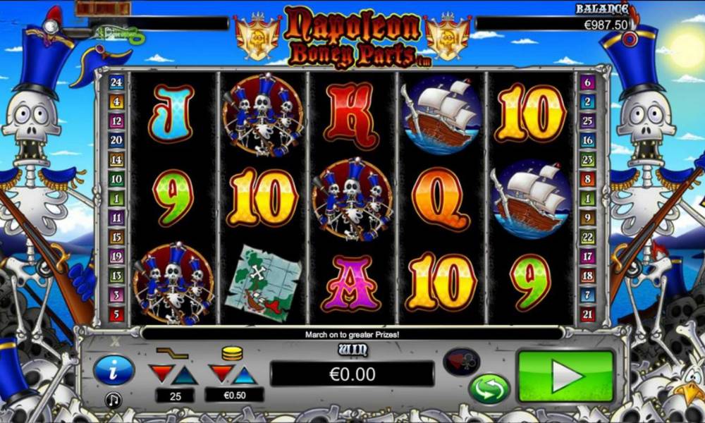 Кто желает разнести знаменитого полководца Наполеона по косточкам и вдобавок получить за это денежный приз? Видеослот Napoleon Boney Parts наглядно демонстрирует воинственный скелет императора, его мертвяцкое войско, карты и корабли. Даже очаровательные дамы – это всего лишь изящно составленные наборы костей. А вот выигрыши в слоте вполне настоящие и достаточно крупные, максимальный составляет 10 000 монет. В игре присутствуют все составляющие, необходимые для интересного времяпровождения: символы Wild и Scatter, бесплатные вращения, бонусный раунд с призами, риск-игра.