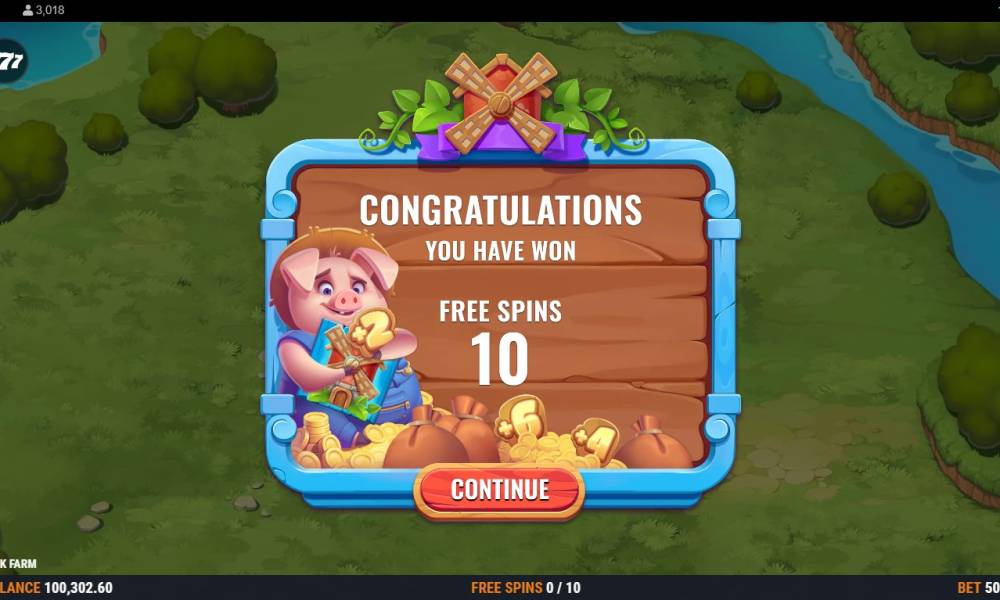 Фриспины в Oink Farm можно выиграть, собрав 3 знака Scatter в любой части поля (даже не в выигрышной комбинации). Если это произойдет, игрок получает 10 бесплатных вращений. Ставка во фриспинах будет той же, которая действовала, когда игрок собрал 3 символа Scatter. Если во время бесплатного вращения выпадает даже 1 знак Scatter — дается +2 фриспина. В бесплатных спинах может активироваться функция Wild Reel.
