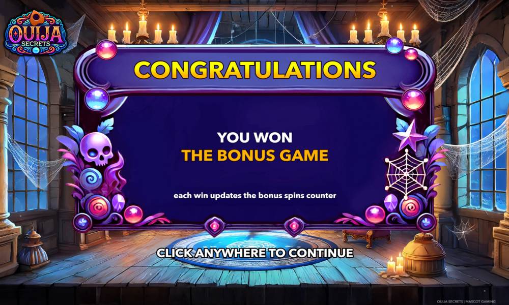 Ouija Secrets посвящен популярной детской игре с доской, которая якобы позволяет разговаривать с духами. Слот на такую необычную тему выпустил провайдер Mascot Gaming в середине октября 2024. Бонусный функционал мне не понравился: есть интересный бонус-раунд и риск-игра. Поэтому почти весь игровой процесс — это обычные вращения (потому что фриспинов тоже нет). Зато есть большая максимальная выплата, которая ограничена множителем х10000.