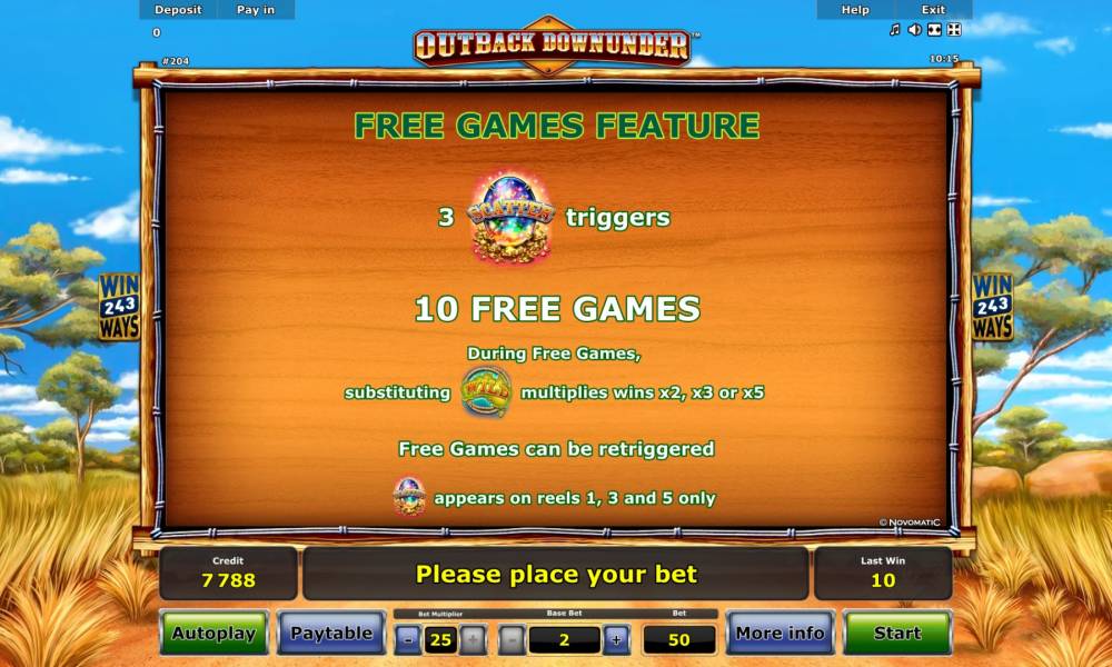 В помощь игрокам в слоте Outback Downunder разработчик предоставил функцию бесплатных вращений, которая активируется при возникновении на 1, 3 и 5 барабанах от трех скаттер иконок.