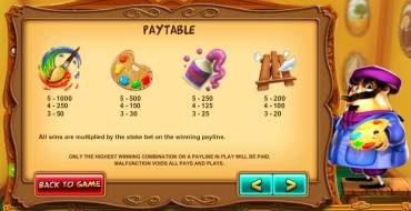 Все сделано по существу, претензий к количеству игровых линий и барабанов нет, так как их хватает, что бы ощутить весь вкус игры. Кроме того автомат сделан в художественном стиле, порадовал персонаж художник с мольбертом в руках. Играть одно удовольствие.