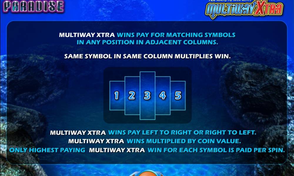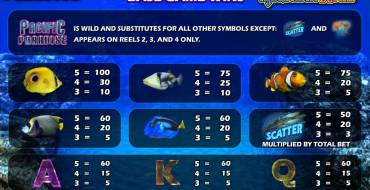 По названию игрового автомата легко можно догадаться, что на его барабанах изображены различные обитатели фауны Тихого океана. Запустив игру, вы увидите разноцветных рыбок. Также разработчики не обошлись без карточных номиналов (Q, K, A). Картинки могут быть одиночными или двойными (Dual). Парные формируют более ценные комбинации. Есть специальные элементы Wild (логотип Pacific Paradise), Bonus (медузы) и Scatter (дельфин). Их возможности рассматриваются ниже: Wild представлен только в трех средних колонках. Этот символ не порадует вас выплатами, однако он может подменять недостающие картинки (кроме скаттеров и бонусных) в цепочках из других изображений. Scatter формирует выигрышные последовательности независимо от расположения на экране. Bonus дает старту раунду фри-спинов, когда пять бонусных элементов оказываются на разных барабанах. Бесплатных спинов предлагается десять. В них деньги на кон за вас будет ставить казино. Размер ставки останется прежним. Спины могут быть продлены, но не более 260 подряд.