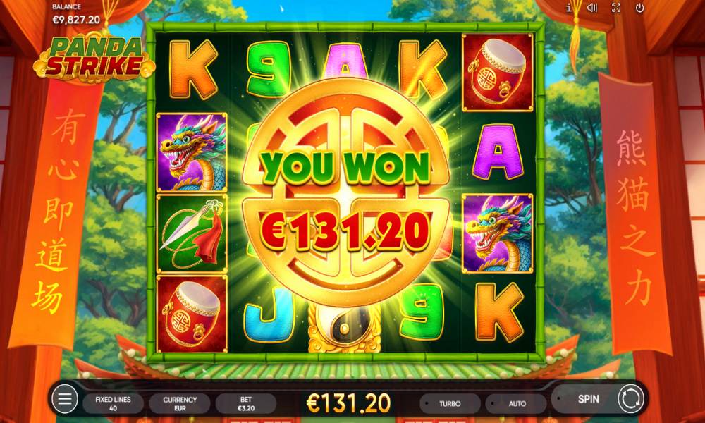 Онлайн-слот Panda Strike предлагает игру на сетке из 5 барабанов в 4 ряда с 40 фиксированными линиями выплат. Для выигрыша необходимо, чтобы 5 одинаковых символов выстроились на соседних барабанах подряд, при этом счет ведется с крайнего левого. Символы Scatter учитываются независимо от позиции на барабанах. Если на поле выпадает 3 и более одинаковых символов (для Scatter – 3 штуки), к ставке применяется множитель. Размеры множителей для каждого вида символов указаны в таблице выплат. Максимальное значение х6.25 к ставке дает появление 5 символов Дракона. Диапазон ставки – от 0.4 до 160 евро.