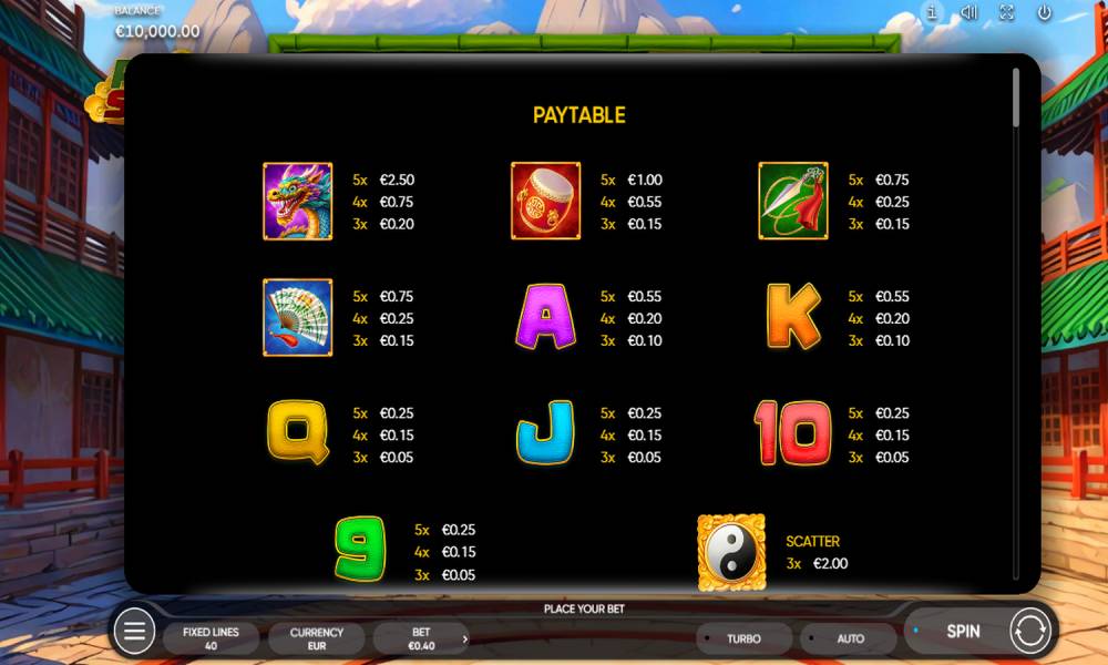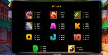 Символ Scatter – знак инь и ян. Появляется на 2, 3 и 4 барабанах. Выпадение 3-х скаттер является триггером бесплатных игр.