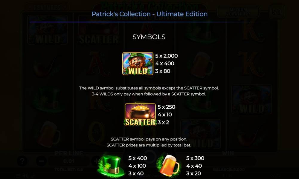 В онлайн-слоте Patrick’s Collection – Ultimate Edition вся игровая механика тесно связана с уровнем волатильности, который устанавливает пользователь перед началом игровой сессии. Неизменными остаются лишь размер поля барабанов и принцип составления комбинаций. Диапазон ставок, количество фиксированных выплат, таблица коэффициентов — все эти параметры изменяются вместе с дисперсией. Для образования комбинаций требуется расположение минимум 3 одинаковых символов подряд (либо с использованием знака Wild), от левого барабана к правому. Игровое поле имеет сетку 5х4. Бонусы в слоте не реализованы, тут не встретить фриспины либо респины. Однако знаки Wild и символы Scatter выпадают довольно часто, что приводит к неплохим значениям выигрыша.