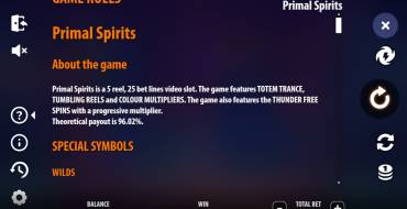 Видеослот Primal Spirits имеет 5 барабанов в 3 ряда и 25 фиксированных линий выплат. В игре использована каскадная механика, когда выигрышные сочетания удаляются, чтобы на их место упали новые символы. Выигрышной считается комбинация из одинаковых символов, размещенных подряд на барабанах слева направо. При выпадении 3 и более одинаковых символов гарантируется применение множителя к ставке, его размер зависит от количества и вида символов. Информация о множителях размещена в таблице выплат. Размер ставки варьируется от 0.25 до 100 евро.