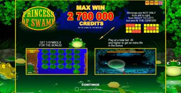 В Princess of Swamp популярная схема игрового поля 5х3, с необычными 9 фиксированными линиями выплат. Символы имеют отсылку к классическим слотам, всего их 7 рядовых и 2 специальных. Учет комбинаций проходит крайне оригинально. Для получения выигрыша необходимо расположение 3 одинаковых знаков подряд на одной из линий без обязательной привязки к левому или правому барабану. Ставка может быть установлена из диапазона 0.09 - 27 евро, но это не константа и значения редактируются казино. Фриспины отсутствуют, но есть сразу 2 идущих подряд бонуса.