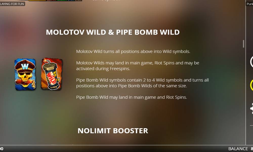 Nolimit Booster. Пользователь может увеличить свою ставку в два раза (при выплате считается только половина), чтобы гарантировано получить на втором барабане один из специальных символов — Bonus, xWays, Super xWays, Molotov Wilds, Pipe Bomb Wild.