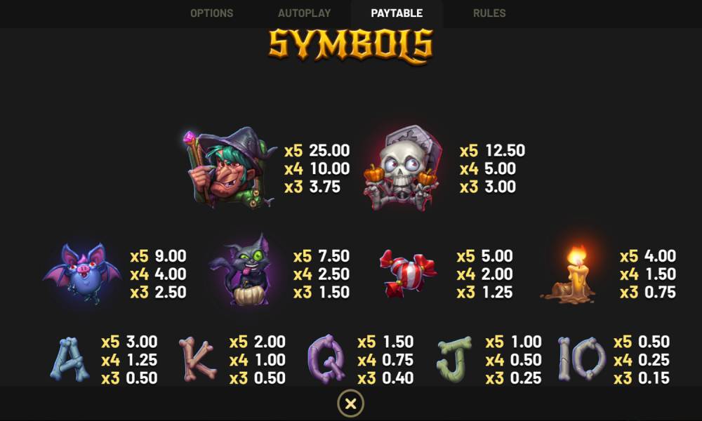 | Тематика | Фрукты/овощи, Классические слоты, Волшебство, Удача, Действие, Огонь, Жуткий, Мистик, Ведьмы & Волшебники, Хэллоуин |