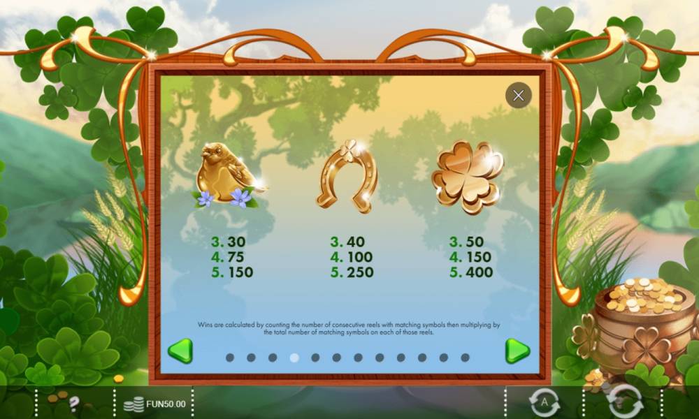 Создатели видео-слота изобразили на барабанах ягоды, бокал с пивом, арфу, сердце, а также золотые кулоны в форме птички, подковы и четырехлистного клевера. Одинаковые иконки могут следовать друг за другом в колонках, но они редко выпадают длинными вертикальными стеками.