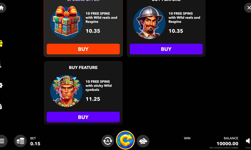 Buy Free Spins. Магазин с покупным бонусом. Есть 3 пакета, в каждом по 10 ФС. 2 пакета обычные, отличия между ними в функциях. В одном — Wild Reel и Respins, во втором — Sticky Wild. Третий пакет специальный (Special Offer). Функция в нем меняется после каждого простого вращения.