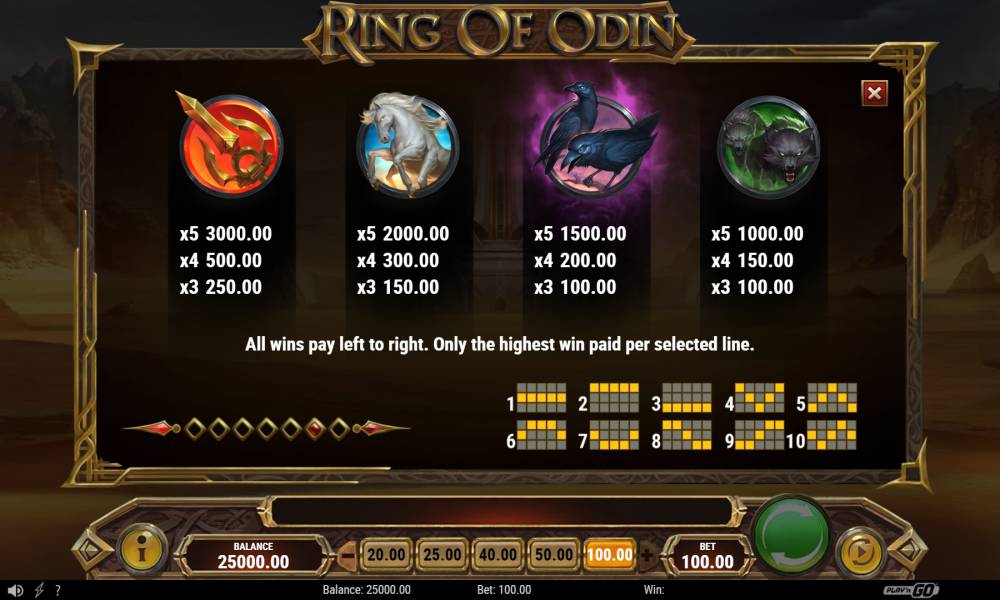 Оплачиваемые цепочки в игровом аппарате Ring of Odin формируются на десяти линиях. Несколько одинаковых изображений должны расположиться в виде непрерывной последовательности, начинающейся с первой колонки. Допускается более одной комбинации по результатам спина.
