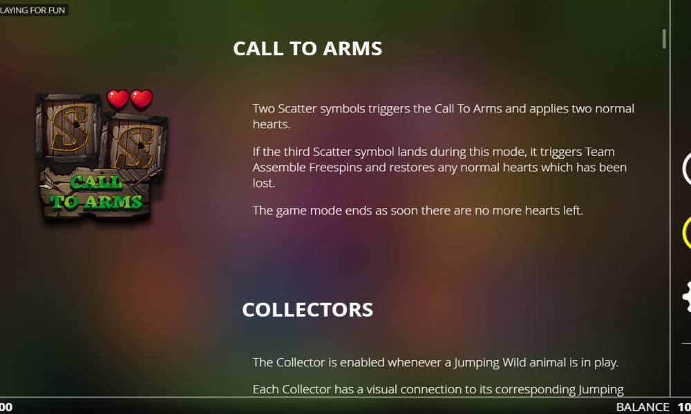 Call to Arms. Запускается двумя символами Scatter. Игроку дается два сердца. Если выпадет третий знак разброса за это время, то раунд перейдет в Team Assemble. При этом потерянные сердца будут восстановлены.