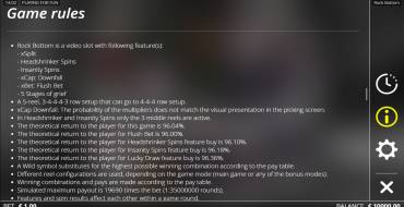 Онлайн слот Rock Bottom достаточно простой по механике и функциям, с ним все просто. При этом он быстро затягивает призами и креативной анимацией. Оторваться от автомата сложно, поэтому нужно сразу приготовиться к долгой и увлекательной игре.