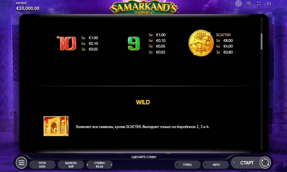 Интерфейс слота понятен даже самым неопытным игрокам. В центре экрана на фоне величественного Самарканда расположились барабаны. Нижняя часть поля отведена под кнопки управления. В верхнем правом углу размещены правила и таблица выплат (кнопка i). Для начала игры достаточно: