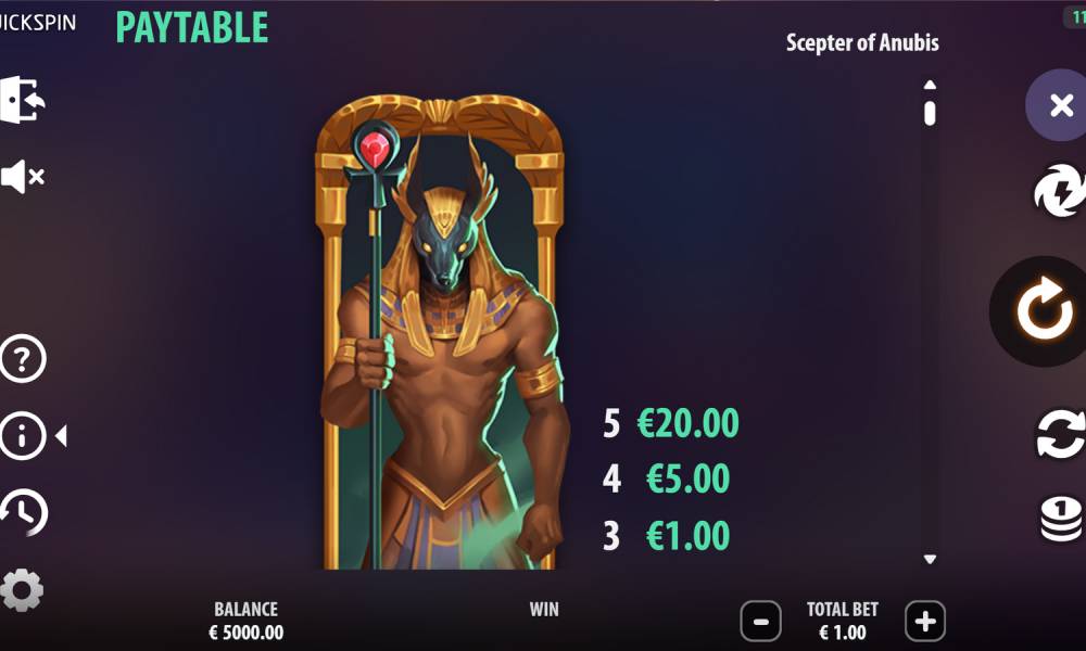 Scepter of Anubis – отличное предложение от Quickspin для поклонников египетской тематики и мощных бонусов. Высокая волатильность и крупные множители подогревают азарт, а красивая графика делает игровой процесс исключительно приятным. Видеослот подходит как для опытных игроков, так и для тех, кто хочет острых ощущений от редких, но впечатляющих выигрышей.