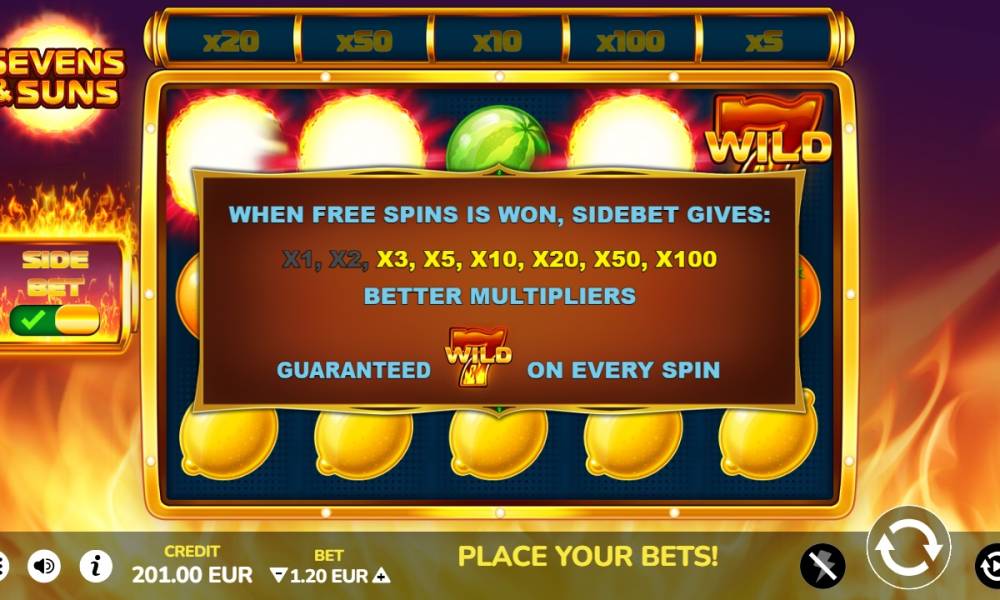 Sevens&Suns — это онлайн-слот с пятью барабанами по три ряда символов. Игра использует 4 младших и 2 старших знака. Все фрукты дают выплаты от трех штук. Семерка и дикий символ приносят призы от двух. Выигрышные комбинации складываются на 10 фиксированных линиях выплат. Собирать их нужно строго подряд с крайнего левого барабана. Ставку на спин можно делать в диапазоне 0,1-100 евро, вариантов всего 16. Максимальный выигрыш составляет х10000. Пользователям доступны бонусы — бесплатные вращения, знак Wild, Multipliers. Провайдер добавил опцию Side Bet для тех, кто не боится рисковать и желает сорвать куш покрупнее.