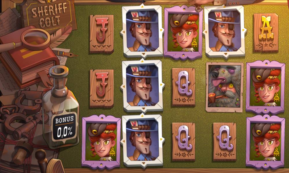 В онлайн слоте Sheriff Colt игровое поле состоит из 5 барабанов и 3 рядов, а выигрышные комбинации формируются на 10 фиксированных линиях. Для победы нужно собрать минимум три одинаковых символа. Ставки за одно вращение варьируются от 10 до 10 000 монет, а максимальный выигрыш достигает 5500x вашей ставки. В слоте есть липкие Wild символы, которые запускают повторные вращения, и раунды фриспинов с 10, 12 или 15 бесплатными вращениями.