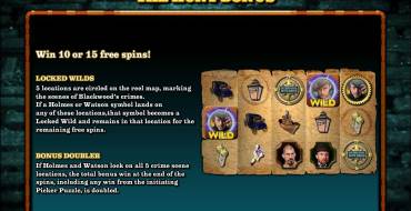 С бонусом «Охота» вы можете помочь Шерлоку и Ватсону найти пять мест преступлений Блэквуда. Если вы найдете 3 подсказки на карте, вы получите 10 бесплатных вращений, а 4 подсказки на карте дадут вам 15 бесплатных вращений. Бесплатные вращения не могут быть запущены повторно. Они разыгрываются с тем же номиналом монет и тем же количеством линий, что и запускающее вращение.