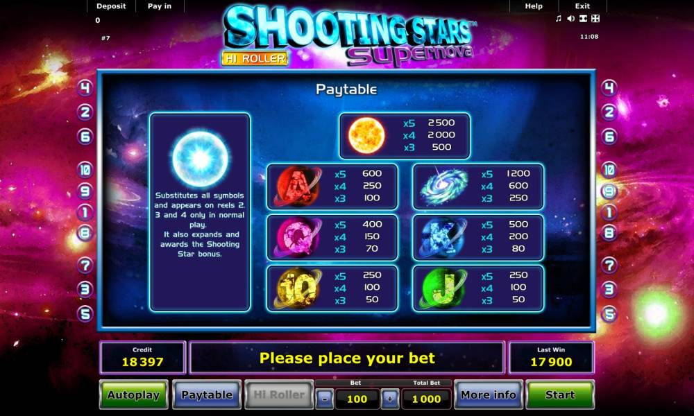 Несколько лет тому назад компания Novomatic выпустила игровой автомат Shooting Stars. Он понравился любителям азартных развлечений интересными бонусами, многочисленными выплатами и приятным дизайном. Теперь знаменитый разработчик предлагает новую версию слота, получившую название Shooting Stars Supernova. От первого варианта она отличается улучшенным дизайном и дополнительными возможностями геймплея. С ними вас познакомит обзор Casinoz.