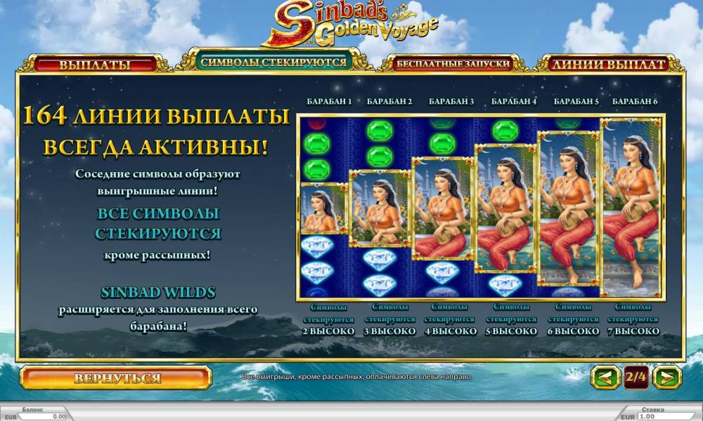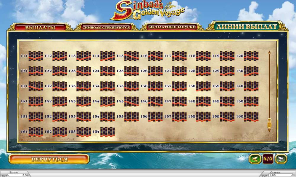 Слот Sinbad’s Golden Voyage имеет 164 линии выплат.