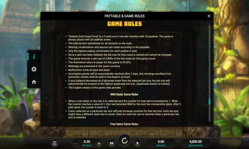 Snake's Gold Dream Drop от Relax Gaming — это видеослот с 10 фиксированными линиями выплат и раскладкой символов на 5 барабанах. В игре используются различные символы, включая стандартные знаки джунглей. Также в игре встречаются специальные символы, такие как символ Wild и символ Scatter, которые активируют бонусные фриспины. Выигрышные совпадения начинаются с левого барабана от трех и более одинаковых символов. Минимальная ставка составляет €0.20, а максимальная — €100, это позволяет игрокам выбирать комфортный диапазон финансового риска во время игры. Максимальный выигрыш составляет до 5000x от номинала ставки.