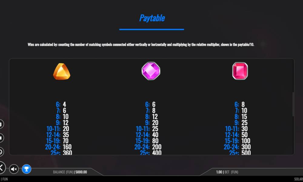 Для получения выигрыша в этом игровом аппарате необходимо собрать комбинацию из 5 или более одинаковых символов, расположенных на смежных клетках поля.