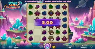 Space Gems. Rockblocks — это слот с большим полем 6х6 и с выплатами без линий. Платят 5+ одинаковых знаков, если они появятся рядом друг с другом, соприкасаясь хотя бы одной стороной (кроме углов, соседство по диагонали не считается). Также есть символ Astronaut, который платит на любых ячейках. После любого выигрыша запускается каскад и заплатившие знаки исчезают с поля.