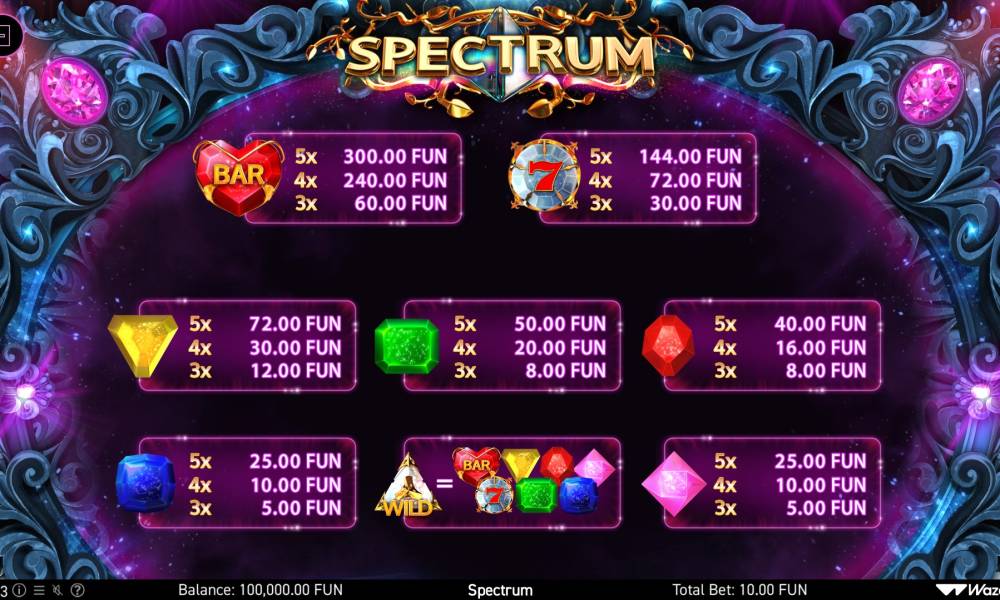 В онлайн слоте Spectrum все просто с правилами. Они прописаны в информационном разделе. Игровое поле состоит из 5 барабанов и 3 рядов, создавая классическую структуру для удобной игры. В игре есть 10 выигрышных линий, которые оплачиваются в обе стороны, теперь у вас больше шансов на выигрыш. Комбинации формируются из одинаковых символов, которые есть в таблице выплат. Ставки могут быть любые в диапазон от 0.2 до 10000 монет. В Spectrum предусмотрена функция регулируемой волатильности, которая дает возможность выбрать частоту и размер выигрышей в зависимости от вашего стиля гемблера.