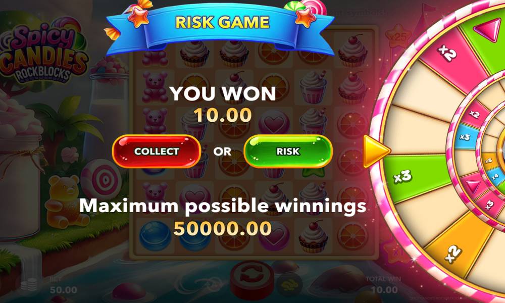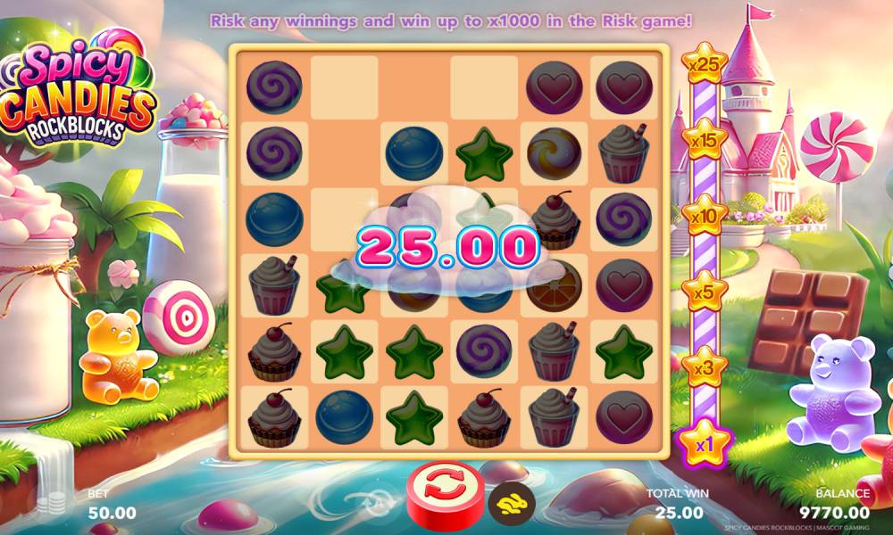 Spicy Candies. Rockblocks — это слот, выпущенный студией Mascot Gaming в конце декабря 2024. Имеет большое поле 6х6 с выплатами за блоки из 5+ знаков, выпавших рядом. После каждой выигрышной комбинации запускается каскад и увеличивается дополнительный множитель. Он может дойти до х25 в серии из 6+ выплат в одном каскаде. Базовые призы за простые знаки небольшие. Есть риск-раунд с колесом фортуны. С одного каскада можно выиграть не более чем х3500, а в риск-раунде — не более х1000.