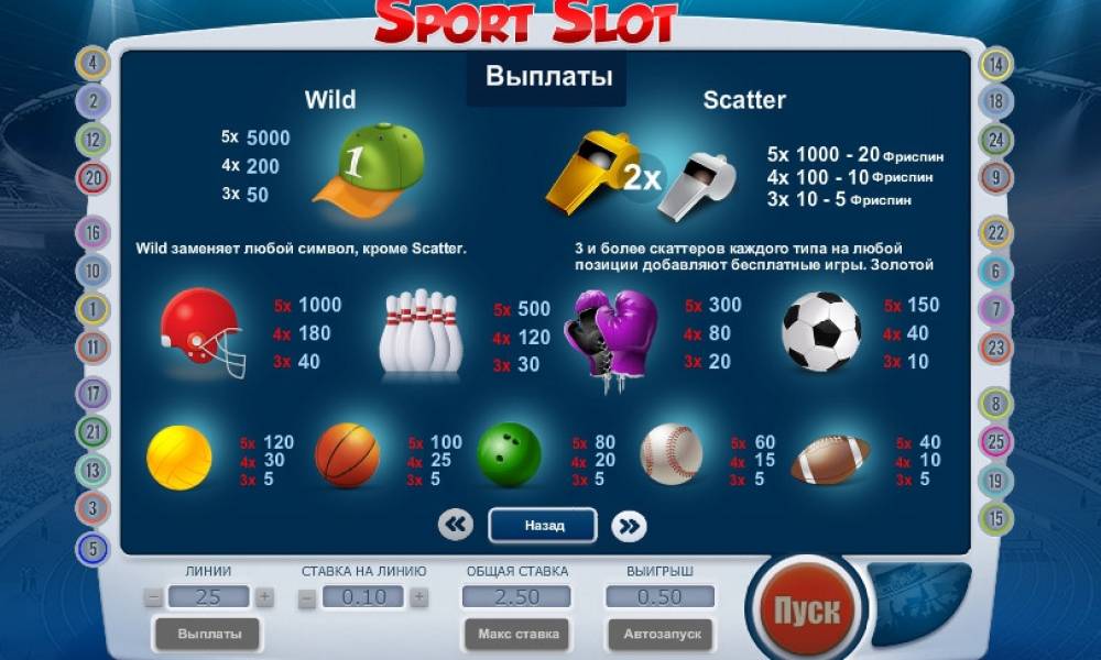 Бесплатный игровой автомат Sport Slot предназначен для азартных людей, которые не мыслят жизни без спорта. Возможно, эта модель не поразит вас качеством графики и разнообразием функций, однако она представляет собой неплохой видео-слот с полным переводом на русский язык и прочими плюсами. Все ее особенности рассматриваются ниже, в обзоре, подготовленном экспертами портала Casinoz.