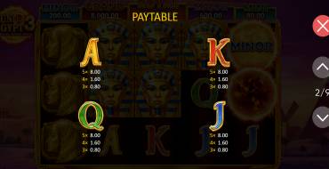 В игровом автомате Sun of Egypt 3 5 барабанов по 3 ряда. На нем появляются тематические египетские символы и стилизованные обозначения старших карт. Всего предложено 8 базовых знаков, по 4 вида низко- и высокооплачиваемых. Все они составляют выигрышные цепочки из 3-5 штук, собранных от левого края к правому. Линий для выплат фиксировано 25. Есть также несколько специальных символов, которые активируют бонусные функции и помогают выигрывать крупные призы. Пользователей ждут фриспины, респины и джекпоты. Максимальный выигрыш, на который они могут рассчитывать, составляет х10000 от ставки. На спин можно выбирать суммы в диапазоне 0.25-20 евро.
