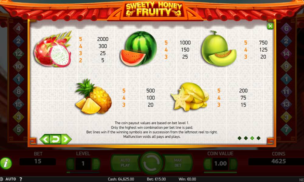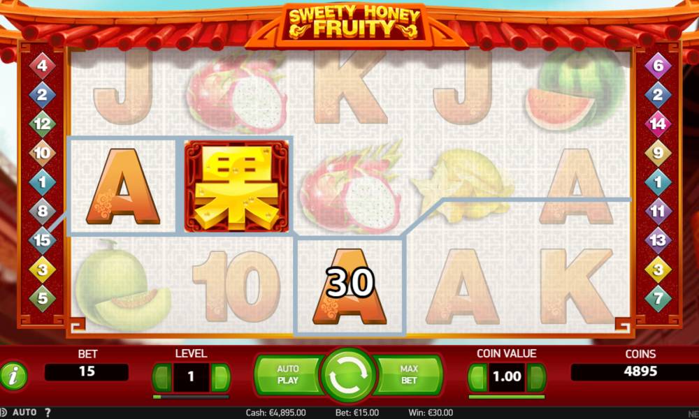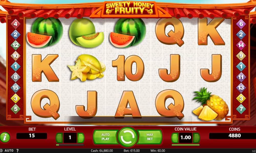 «Сладкий, медовый, фруктовый» слот – модель с пятью барабанами, пятнадцатью активными линиями для выигрышных комбинаций и тремя рядами иконок на основном экране. Количество полос не меняется.