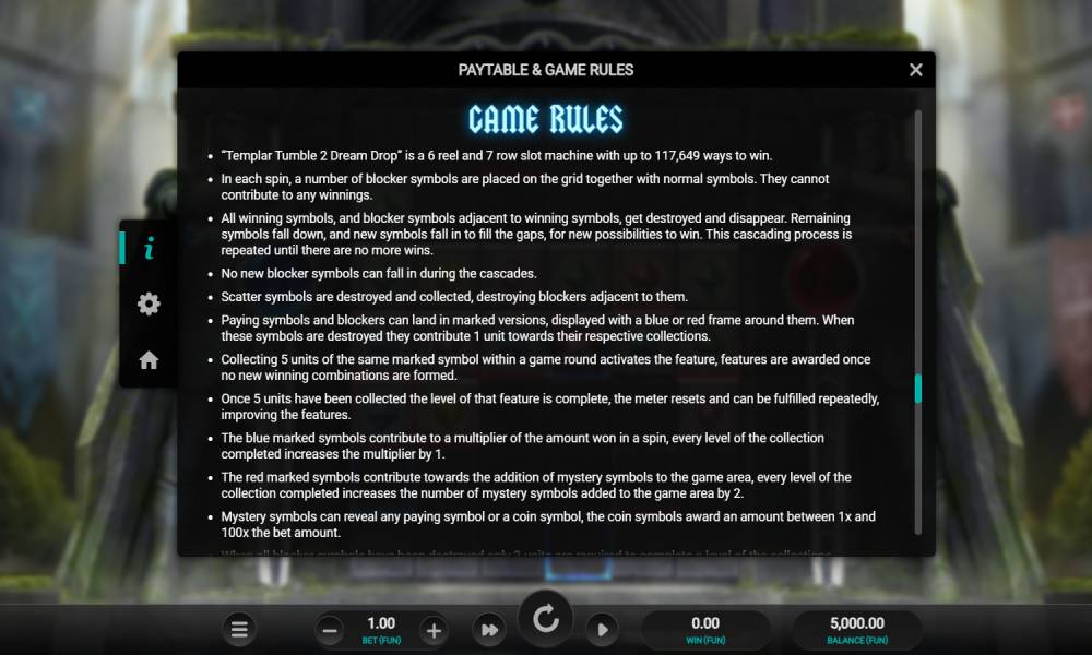 В Templar Tumble 2 Dream Drop основное действие происходит на 6 барабанах с до 117,649 способами выигрыша, где призовые комбинации формируются при выпадении одинаковых символов на соседних барабанах. Среди символов можно выделить обычные и блокирующие, а также специальные красные и синие рамки, которые активируют бонусные функции: красные приносят множители, а синие — загадочные символы. При каждом удачном спине разрушенные блоки помогают продвинуться по игровым уровням и увеличивают шансы на получение фриспинов.