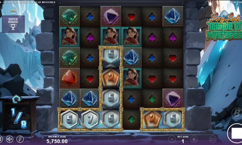 В слоте Lucy Luck and the Temple of Mysteries используется 6 барабанов с 6 ячейками на каждом. Линии для построения комбинаций не используются вообще. В зачет идут все символы, которых на поле выпадет 8 и более. Используется каскадная система обновления сыгравших знаков. Бонусы доступны не только во время фриспинов, но и в обычном режиме. Ставки фиксированы, игроку остается только выбрать подходящую из диапазона от 0.2 до 60 у.е.