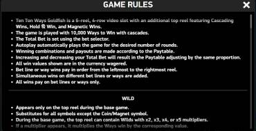 Высокая волатильность — выигрыши нечастые, но крупные. Поэтому играть в Ten Ton Ways Goldfish лучше с не-минимальным депозитом, или по минимальной ставке, и устраивать длительные сессии (хотя бы 20-30 минут).