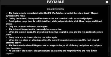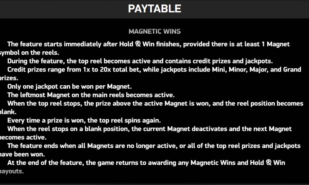 Magnetic Wins. Может запуститься после завершения Hold And Win Feature, если в нем на поле присутствовал хотя бы 1 символ Magnet. При запуске дополнительный ряд над основным полем открывается. На нем есть символы Coin с множителями и джекпотами. Гемблеру нужно запустить вращение и после остановить его. Вращение ряда происходит не сверху вниз, а слева направо. При остановке гемблер получает награду, которая выпала, а ячейка, в которой она была — пустеет. Игра продолжается до тех пор, пока вращение не остановится на уже опустевшей ячейке. Если на поле есть еще символы Magnet — гемблер продолжает игру в Magnetic Wins до тех пор, пока все Magnet не остановятся на пустой ячейке.
