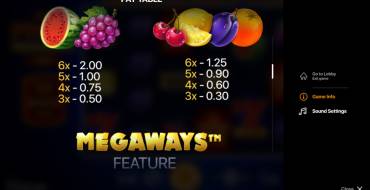 Игровой автомат The Fruit Megaways от провайдера Playson имеет классическое поле, состоящее из 6 барабанов, количество символов в которых определяется механикой Megaways. Выплаты производятся по 117649 комбинациям.